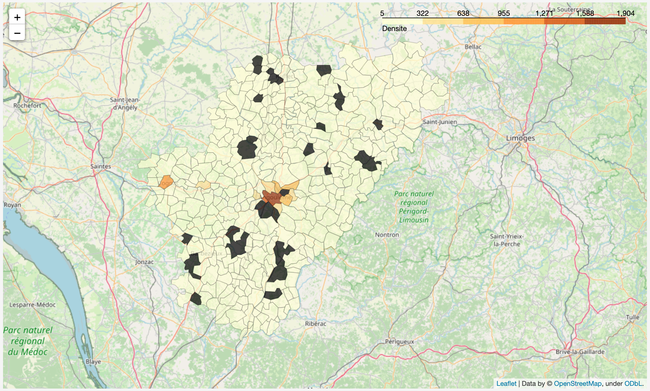 Enfin, ils ont utilisé les données contenues dans la base de données pour créer des cartes avec un calque superposé se colorant en fonction de l'attribut choisi, qui pouvait être la densité de population ou encore l'altitude.
