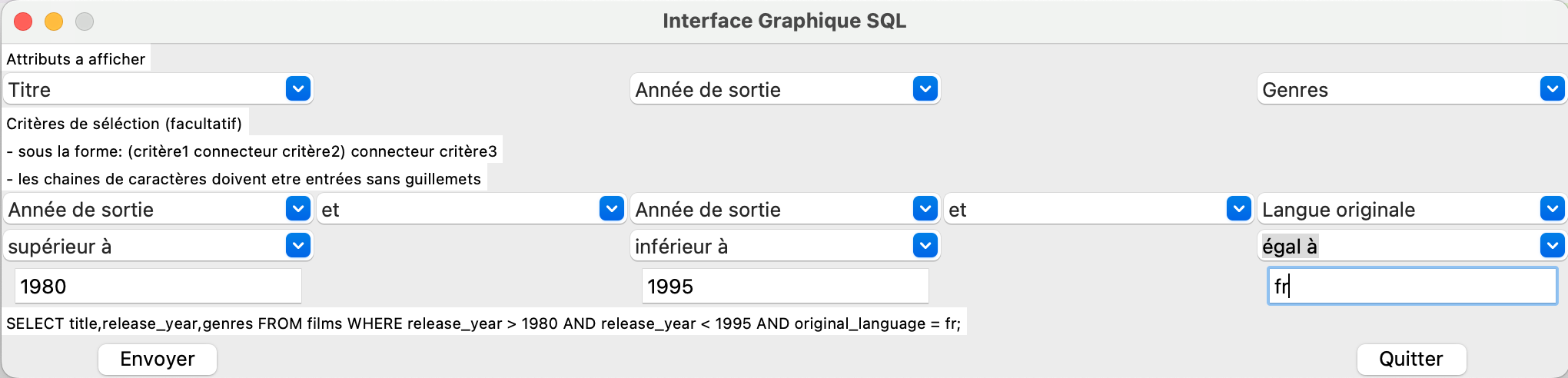 Après avoir travaillé sur les bases de données, les élèves ont développé ce premier projet pour lequel ils devaient réaliser une interface en Python permettant une gestion d'une vidéothèque gérée par une base de données. La difficulté ici était de manipuler un fichier de base de données à l'aide du langage Python et de proposer une interface graphique, réalisée à l'aide du module Tkinter pour rendre l'uilisation plus conviviale pour les utilisateurs.